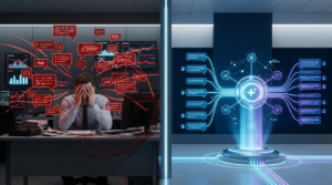 A 3D render showing a split-screen comparison. Left side: a stressed community manager overwhelmed by floating red message icons. Right side: A calm, glowing ChatPlus AI interface smoothly responding to multiple blue user queries simultaneously. Clean, professional tech aesthetic.