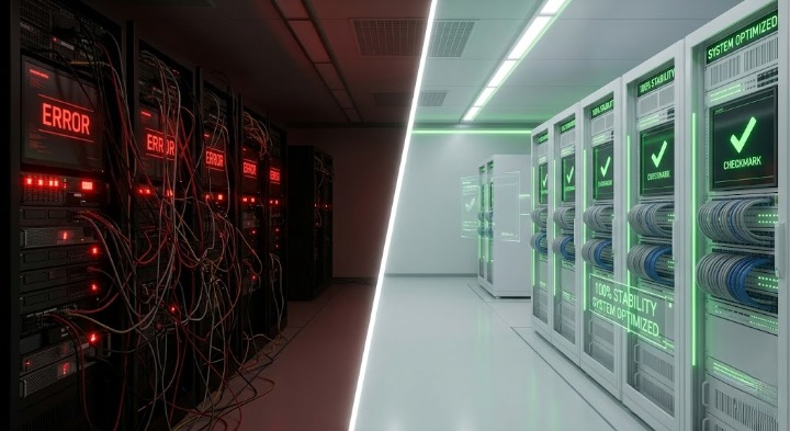 A 3D realistic split-screen comparison. On the left, a dark server room with red “Error” alerts and tangled wires representing failed logic. On the right, a bright, organized digital architecture with green “Checkmark” icons and 100% stability indicators. Minimalist tech style.