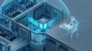 A high-end isometric 3D render of a secure digital vault representing a Software House, contrasted with a fading, translucent human silhouette representing a disappearing freelancer. Tech blue and steel grey color palette, professional corporate lighting, representing security and business continuity, no text, 16:9.