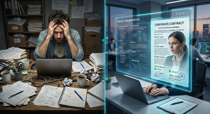 A 3D realistic split-screen comparison. On the left, a cluttered desk with messy, unorganized notes representing a freelancer’s lack of documentation. On the right, a clean, glowing holographic interface showing structured code documentation and a signed corporate contract. Professional tech aesthetic.