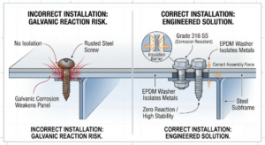 When aluminum panels are fastened using regular screws, a chemical reaction between the two metals may occur, leading to galvanic corrosion. This reaction weakens the structure and reduces its lifespan.
