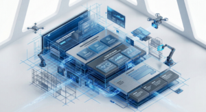 A highly detailed isometric 3D render of a premium corporate website interface being architected. Glowing blue grid lines, sharp geometric elements, Tech Blue and Steel Grey palette. “Engineering Precision meets Digital Fluidity” style, clean corporate lighting, no text, white background.
